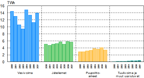Uusiutuvilla energialähteillä tuotetun sähkön määrä kasvoi 25 prosenttia vuonna 2007, kun viime vuosina laskenut vesivoiman tuotanto kääntyi nousuun. Puupolttoaineilla tuotettu sähkö väheni 16 prosenttia ja metsäteollisuuden jäteliemillä tuotettu sähkö 3 prosenttia. Puupolttoaineiden käyttö väheni hieman puu- ja paperiteollisuuden tuotannon vähenemisen johdosta, mutta suurin väheneminen syy oli puupolttoaineiden korvaaminen turpeen käytöllä. Tuulivoimalla ja muilla uusiutuvilla energialähteillä tuotettiin sähköä noin 20 prosenttia enemmän kuin edellisenä vuonna.