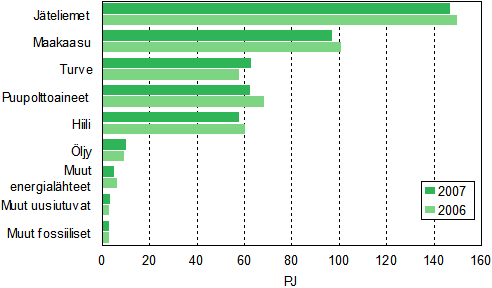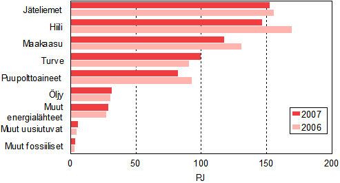 Polttoaineiden käyttö sähkön ja lämmön tuotannossa väheni 5 prosenttia vuonna 2007. Eniten väheni hiilen käyttö, 13 prosenttia. Myös maakaasun, puupolttoaineiden ja metsäteollisuuden jäteliemien käytöt vähenivät. Turpeen ja uusiutuvien energialähteiden (mm. kierrätyspolttoaineiden ja biokaasun) käyttö puolestaan kasvoi.