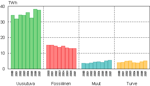 Kuvio 10. Teollisuuslämmön tuotanto polttoaineilla 2000-2007