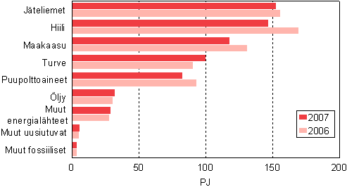 Kuvio 12. Polttoaineiden käyttö sähkön ja lämmön tuotannossa yhteensä 2006-2007