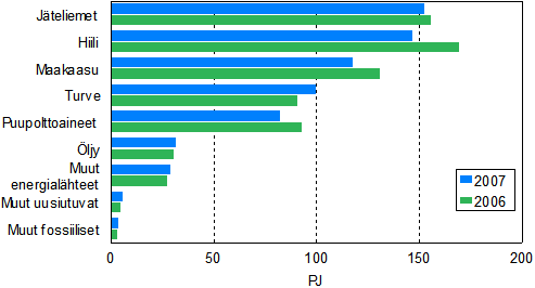 Polttoaineiden käyttö sähkön ja lämmön tuotannossa väheni 5 prosenttia vuonna 2007. Eniten väheni hiilen käyttö, 13 prosenttia. Myös maakaasun, puupolttoaineiden ja metsäteollisuuden jäteliemien käytöt vähenivät. Turpeen ja uusiutuvien energialähteiden (mm. kierrätyspolttoaineiden ja biokaasun) käyttö puolestaan kasvoi.