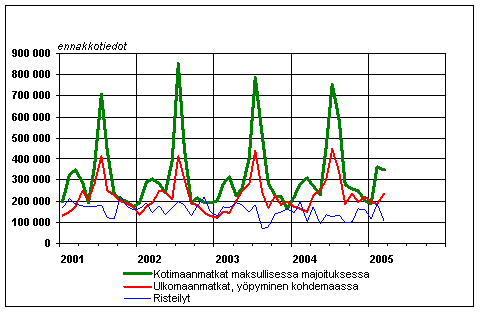 Suomalaisten vapaa-ajanmatkat kuukausittain 2001-2005, ennakkotiedot