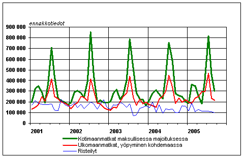 Suomalaisten vapaa-ajanmatkat kuukausittain 2001-2005, ennakkotiedot