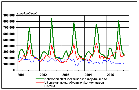 Suomalaisten vapaa-ajanmatkat kuukausittain 2001-2005, ennakkotiedot