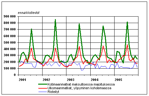 Suomalaisten vapaa-ajanmatkat kuukausittain 2001-2005, ennakkotiedot