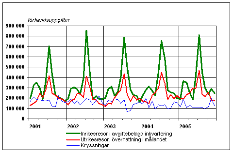 Finländarnas fritidsresor per månad 2001-2005, förhandsuppgifter