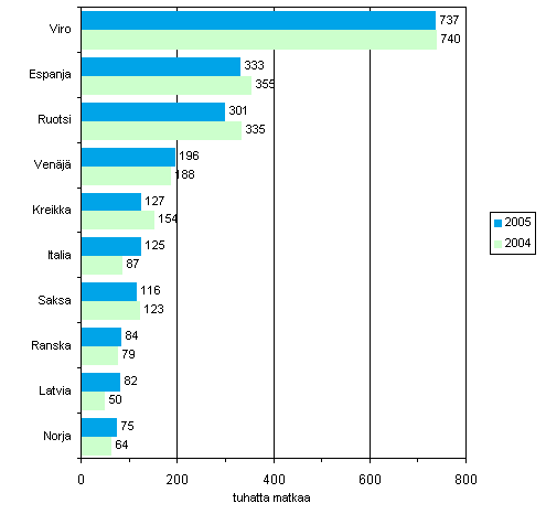 Kohdemaassa yöpymisen sisältäneistä lomamatkoista 1,7 miljoonaa matkaa, 54 prosenttia, suuntautui yhä edelleen Viroon, Espanjaan, Ruotsiin, Venäjälle ja Kreikkaan. Kuitenkin nämä maat menettivät yhteensä 78 000 matkaa. Matkailu väheni tuntuvasti myös Egyptiin ja Kyprokselle. Vuonna 2005 Egyptiin tehtiin 34 000 ja Kyprokselle 14 000 lomamatkaa. Italia ja Latvia sen sijaan kasvattivat suosiotaan. Italiaan tehtiin 125 000 ja Latviaan 82 000 lomamatkaa. Kumpaankin maahan tehtiin yli 30 000 lomamatkaa enemmän edelliseen vuoteen verrattuna.