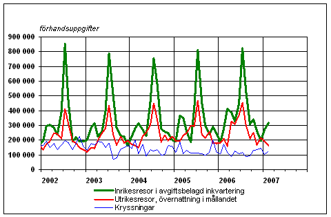 Finländarnas fritidsresor per månad 2002-2007, förhandsuppgifter