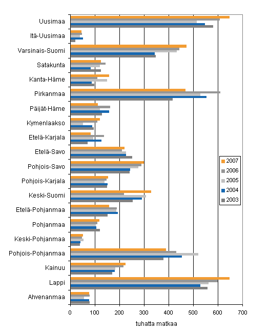 Kotimaan vapaa-ajanmatkat maksullisessa majoituksessa kohdemaakunnittain vuosina 2003-2007