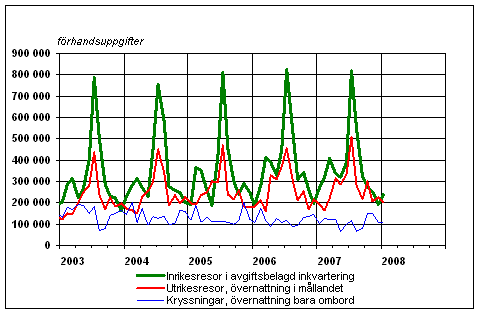Finländarnas fritidsresor per månad 2003-2008, förhandsuppgifter