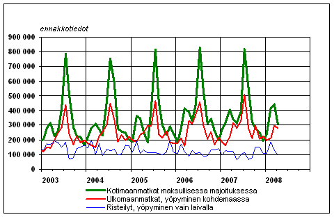 Suomalaisten vapaa-ajanmatkat kuukausittain 2003-2008, ennakkotiedot