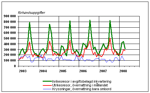 Finländarnas fritidsresor per månad 2003-2008, förhandsuppgifter