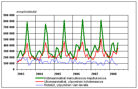 Suomalaisten vapaa-ajanmatkat kuukausittain 2003-2008, ennakkotiedot