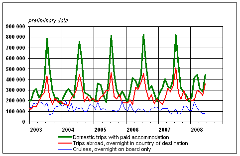 Finnish residents' leisure trips by month 2003-2008, preliminary data