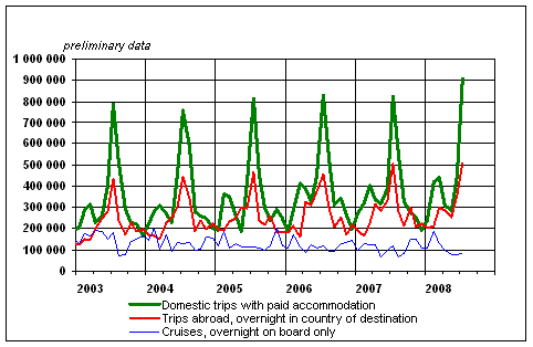Finnish residents' leisure trips by month 2003-2008, preliminary data