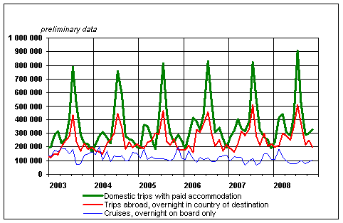 Finnish residents' leisure trips by month 2003-2008, preliminary data