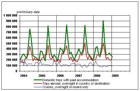 Finnish residents' leisure trips by month 2004-2009, preliminary data