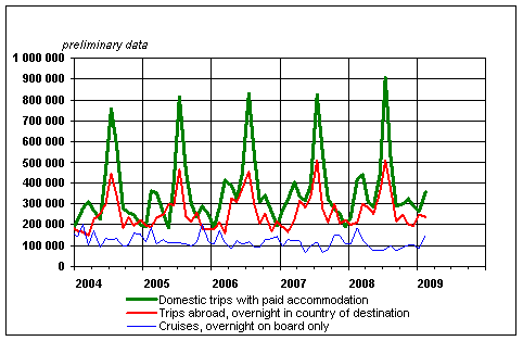 Finnish residents' leisure trips by month 2004-2009, preliminary data