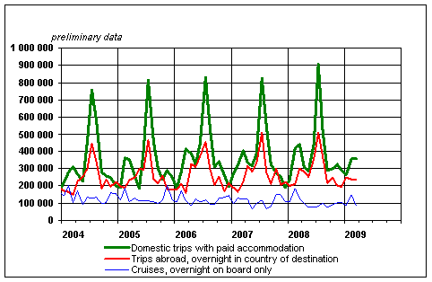 Finnish residents' leisure trips by month 2004-2009, preliminary data