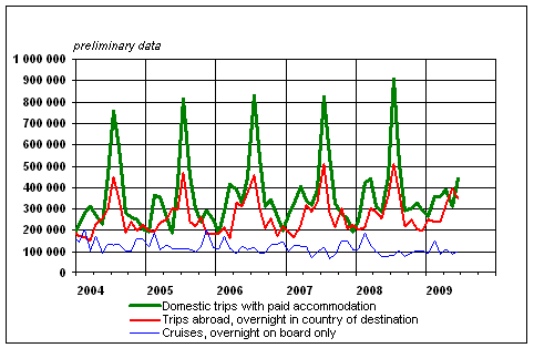 Finnish residents' leisure trips by month 2004-2009, preliminary data