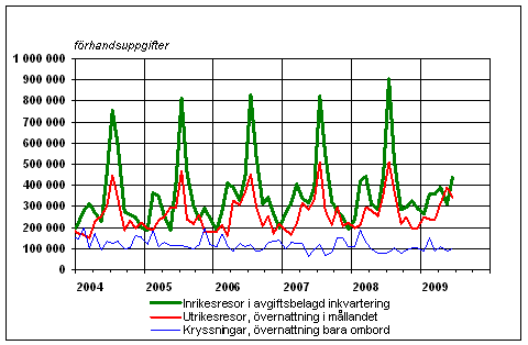 Finländarnas fritidsresor per månad 2004-2009, förhandsuppgifter