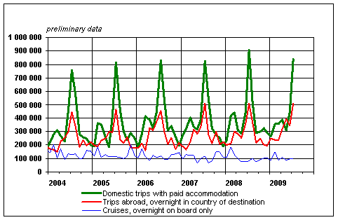 Finnish residents' leisure trips by month 2004-2009, preliminary data