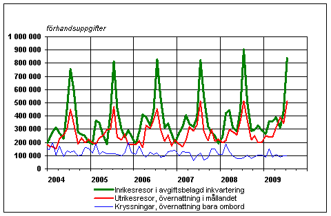 Finländarnas fritidsresor per månad 2004-2009, förhandsuppgifter