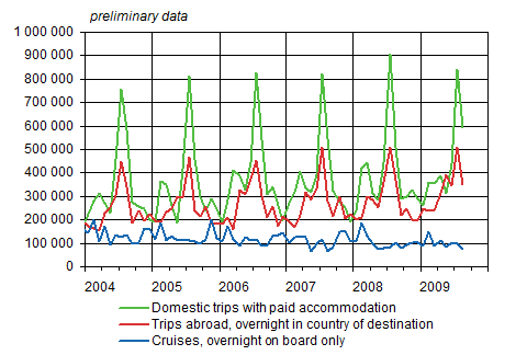Finnish residents' leisure trips by month 2004-2009, preliminary data