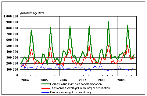 Finnish residents' leisure trips by month 2004-2009, preliminary data