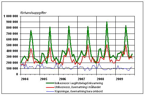 Finländarnas fritidsresor per månad 2004-2009, förhandsuppgifter