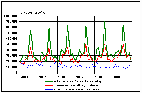 Finländarnas fritidsresor per månad 2004-2009, förhandsuppgifter