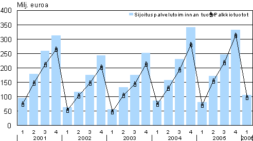Sijoituspalveluyrityksien palkkiotuotot olivat vuoden 2006 tammi-maaliskuussa 99 milj. euroa eli 28 milj. euroa enemmän kuin vuoden 2005 vastaavana ajankohtana. Palkkiotuottoihin sisältyi omaisuudenhoidosta saatuja tuottoja 51 milj. euroa sekä arvopaperin välityksestä saatuja tuottoja 29 milj. euroa. Omaisuudenhoidosta saadut tuotot kasvoivat runsaat 13 milj. euroa ja arvopaperin välityksestä saadut tuotot noin 9 milj. euroa vuoden 2005 vastaavaan ajankohtaan verrattuna. Tiedot ilmenevät Tilastokeskuksen sijoituspalveluyritysten tuloslaskelmia ja taseita koskevista tiedoista.