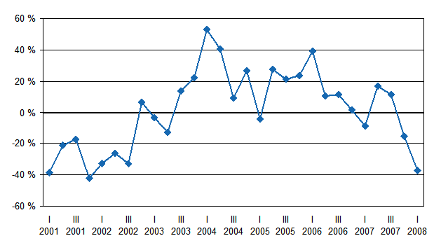 Kun lopetusten ja aloitusten vaikutus jätetään huomiotta tarkastelemalla vain sekä ensimmäisellä neljänneksellä 2007 että ensimmäisellä neljänneksellä 2008 normaalisti toimineita sijoituspalveluyrityksiä, oli palkkiotuotoissa ja liikevoitossa silti laskua. Väheneminen oli kuitenkin selvästi maltillisempaa. Näin laskettuna palkkiotuotot alenivat 11 prosenttia ja liikevoitto 34 prosenttia ensimmäisellä neljänneksellä 2008 vuodentakaiseen verrattuna.