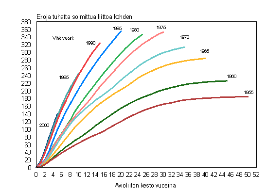 Avioerojen kertymä eri vuosina solmituissa avioliitoissa vuoden 2005 loppuun mennessä