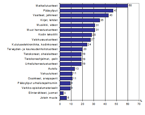Verkkokauppa tuoteryhmittäin keväällä 2008, prosenttia kaikista ostajista, jotka tehneet verkkohankintoja