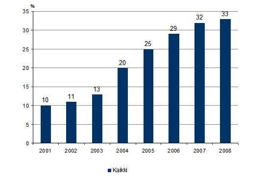 kuukauden aikana vuosina 2001 - 2008, prosenttia