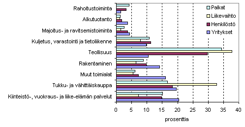 Henkilöstön osuus oli suurin teollisuudessa, 29,8 prosenttia. Tukku- ja vähittäiskauppa työllisti 18,3 prosenttia sekä kiinteistö-, vuokraus- ja liike-elämän palvelut 14,8 prosenttia kaikkien yritysten henkilöstöstä. Kuljetuksen, varastoinnin ja tietoliikenteen osuus oli 11,3 prosenttia ja rakentamisen osuus vajaat kymmenen prosenttia.