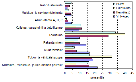 Henkilöstön osuus oli suurin teollisuudessa, 29,0 prosenttia. Tukku- ja vähittäiskauppa työllisti 17,9 prosenttia sekä kiinteistö-, vuokraus- ja liike-elämän palvelut 15,9 prosenttia kaikkien yritysten henkilöstöstä. Kuljetuksen, varastoinnin ja tietoliikenteen osuus oli 11,1 prosenttia ja rakentamisen osuus vajaat kymmenen prosenttia.