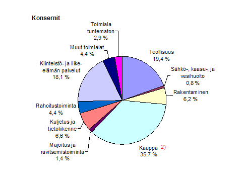 Konserneihin kuuluvien Suomessa toimivien yritysten vuoden 2006 yhteenlaskettu liikevaihto oli 267 miljardia euroa ja ne työllistivät 757 000 henkilöä. Lukumäärältään eniten konserneja oli kaupan toimialalla. Vuonna 2006 Suomessa toimineista konserneista 35,7 prosenttia (1 995) toimi kaupassa, 19,4 prosenttia (1 087) teollisuudessa, 18,1 prosenttia (1 011) kiinteistö- ja liike-elämän palveluissa sekä 6,6 prosenttia (372) kuljetuksessa ja tietoliikenteessä. Teollisuuden toimialalla toimivat konsernit muodostivat kaikkien konsernien liikevaihdosta noin 45 prosenttia ja henkilöstöstä noin 39 prosenttia. Teollisuudessa merkittävin yksittäinen toimiala henkilöstöllä mitattuna oli metalliteollisuus.