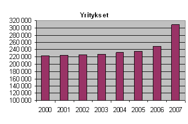 Suomessa toimi 308 917 yritystä vuonna 2007. Määrän kasvu oli 23 prosenttia edellisvuodesta. Suuri muutos johtuu siitä, että tilastoon on otettu mukaan 45 700 maatalousyritystä, joita aiemmissa tilastoissa ei ole ollut. Ilman tätä lisäystä yritysten määrä lisääntyi noin 12 800 yrityksellä eli viidellä prosentilla.