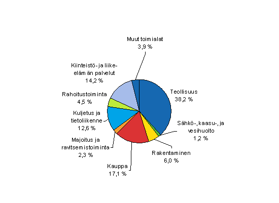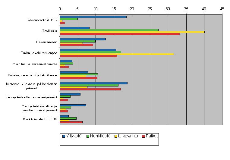 Henkilöstön osuus oli suurin teollisuudessa, 27,2 prosenttia. Tukku- ja vähittäiskauppa työllisti 17 prosenttia sekä kiinteistö-, vuokraus- ja liike-elämän palvelut 16,2 prosenttia kaikkien yritysten henkilöstöstä. Kuljetuksen, varastoinnin ja tietoliikenteen osuus oli 10,5 prosenttia ja rakentamisen osuus vajaat kymmenen prosenttia.