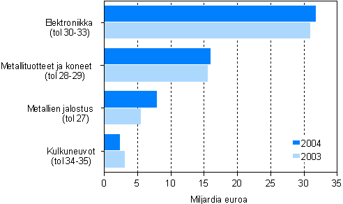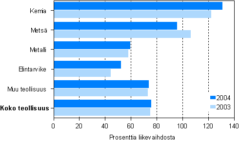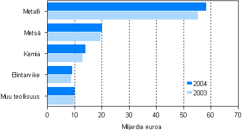 Tehdasteollisuuden liikevaihto kasvoi 4,7 prosenttia, hieman yli112 miljardiin euroon vuonna 2004. Suurten yritysten liikevaihto oli 91,1 miljardia euroa ja pk-yritysten 21,1 miljardia. Pk-yrityksillä liikevaihto kasvoi 3,2 prosenttia ja suurilla yrityksillä 5 prosenttia. Tehdasteollisuuden liikevaihdon 5,1 miljardin kasvusta yli puolet tuli metalliteollisuudesta, jossa liikevaihto kohosi 3 miljardia euroa. Metalliteollisuuden kasvun veturina oli metallien jalostus, jossa liikevaihto kasvoi 2,3 miljardia euroa eli lähes 42 prosenttia. Metalliteollisuus kattaa yli puolet tehdasteollisuuden liikevaihdosta.