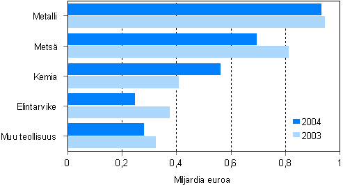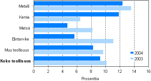 Koko tehdasteollisuuden nettotulos, tulos rahoituserien jälkeen supistui puoli miljardia euroa edellisvuoteen verrattuna. Nettotulos jäi 6,7 prosenttiin liiketoiminnan tuotoista. Suurin muutos oli metsäteollisuudessa, jossa nettotulosta saatiin 1,4 miljardia euroa vähemmän kuin edellisvuonna. Vuonna 2004 metsäteollisuuden nettotulos putosi 4,6 prosenttiin. Metsäteollisuuden saamat rahoitustuotot supistuivat viime vuonna alle puoleen edellisvuoteen verrattuna.
