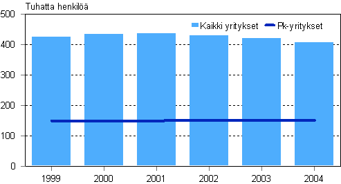Tehdasteollisuusyritykset työllistivät 408 100 henkilöä vuonna 2004, 12 300 vähemmän kuin vuotta aikaisemmin. Henkilöstön määrän vähennykset kohdistuivat lähes kokonaan suuriin yrityksiin. Palkkoja ja muita henkilöstökuluja maksettiin 16,9 miljardia euroa vuonna 2004. Supistuksista huolimatta tuloslaskelman henkilöstökulut kasvoivat vähän edellisvuodesta. Henkilöstökulujen osuus liikevaihdosta oli 15,1 prosenttia.