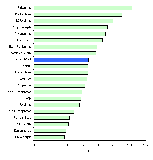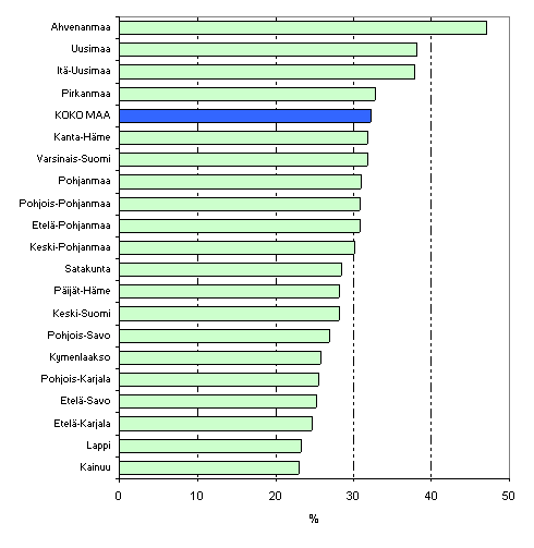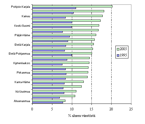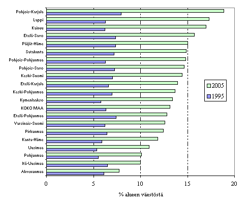Maakunnista korkeimmat pienituloisuusasteet esiintyvät Itä- ja Pohjois-Suomen maakunnissa (kuvio 8). Vuonna 2005 korkein pienituloisuusaste oli Pohjois-Karjalan maakunnassa, jossa keskimäärin joka viides kotitalousväestöön kuuluva tulee luokitelluksi kotitalouden vuositulojen perusteella pienituloiseksi. Selvästi matalin pienituloisuusaste oli vuonna 2005 Ahvenanmaalla, jossa pienituloisten osuus alueen kotitalousväestöstä oli 8,3 prosenttia. Merkille pantavaa on myös se, että Ahvenanmaalla pienituloisuusaste ei ole juuri muuttunut kymmenen vuoden takaisesta tasostaan.
