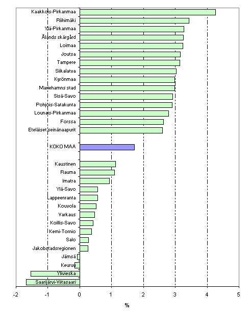 Kotitalouksien tulojen kasvu oli voimakkainta vuonna 2005 Pirkanmaan maakunnassa, missä kotitalouksien käytettävissä oleva rahatulo oli keskimäärin 3,1 prosenttia korkeampi kuin vuotta aikaisemmin (kuvio 1). Kanta-Hämeen maakunnassa vastaava reaalitulojen kasvu oli 2,8 prosenttia, Itä-Uudellamaalla 2,5 prosenttia ja Pohjois-Karjalassa 2,3 prosenttia.