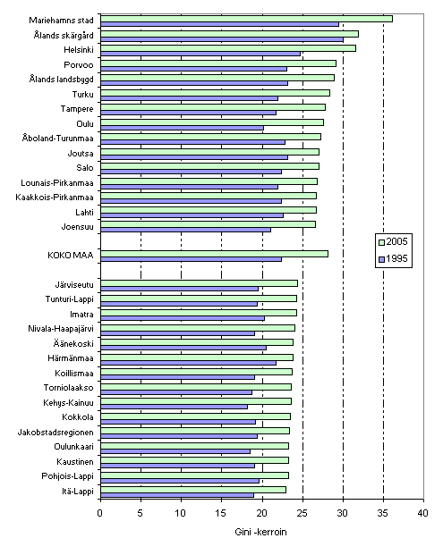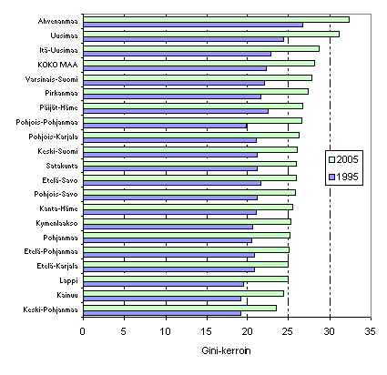 Kotitalouksien väliset tuloerot ovat kasvaneet myös maakuntien sisällä (kuvio 4). Suurimmat tuloerot olivat vuonna 2004 Ahvenanmaan ja Uudenmaan maakunnissa, joissa tuloeroja kuvaava Gini-kerroin ylitti arvon 30 selvästi vuonna 2005. Matalimmat alueiden sisäiset tuloerot olivat Keski-Pohjanmaan ja Kainuun maakunnissa, joissa Gini-kerroin oli alle 25 vuonna 2005. Vuosina 1995-2005 tuloerot ovat kasvaneet jokaisessa maakunnassa. Tuloerojen kasvu on ollut voimakkainta siellä missä tuloeroja heilutelleet omaisuustuloerät ovat olleet yleisempiä (esim. Ahvenanmaa ja Uusimaa). Näissä maakunnissa ovat myös tuloerojen vaihtelut olleet suuria. Keski-Pohjanmaalla, Kainuussa ja Lapissa tuloerojen vuosittaiset vaihtelut ovat olleet vähäisempiä, mutta näissäkin maakunnissa tuloerot ovat kasvaneet selvästi vuosina 1995-2005.