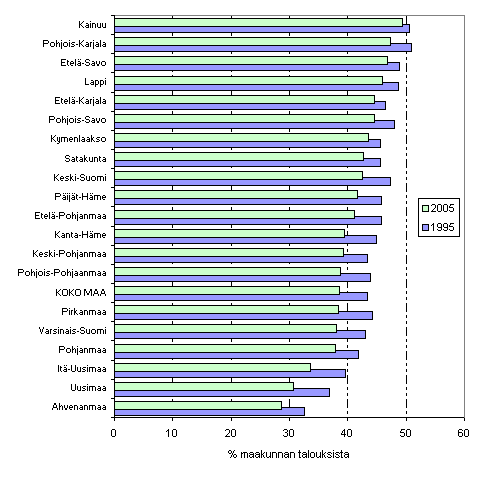 Maakunnista korkein suhdeluku oli Kainuussa, jossa se oli 49 prosenttia vuonna 2005. Merkille pantavaa on kuitenkin se, ettei suhdeluku ole alentunut Kainuussa kuin prosenttiyksikön 1990-luvun puolivälin lamavuosista. Muissakin Itä- ja Pohjois-Suomen maakunnissa saatujen tulonsiirtojen varassa eläviä talouksia löytyy muuhun maahan verrattuna enemmän, mutta näissä maakunnissa suhdeluku on alentunut lamanjälkeisistä ajoista vuoteen 2005 mennessä.