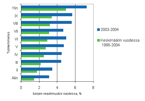 Suurituloisimman kymmenyksen tulot kasvoivat vuonna 2004 keskimäärin runsaat 7 prosenttia edellisvuodesta. Pienituloisimman kymmenyksen tulot kasvoivat 3 prosenttia. Myös pidemmällä aikavälillä ylin tulokymmenys on kasvattanut tulojaan selvästi enemmän kuin muut tulokymmenykset. Vuosina 1995-2004 ylimmän tulokymmenyksen tulot ovat kasvaneet vuodessa keskimäärin noin 5 prosenttia, kun alimmassa tulokymmenyksessä kasvu on ollut puolitoista prosenttia.