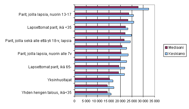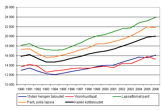 Kaksi ryhmää kuitenkin poikkeavat tulokehitykseltään hieman muista ryhmistä. Lapsettomien parien tulot ovat kasvaneet keskimäärin jonkin verran muiden ryhmien tuloja nopeammin. Vuosina 1990-2006 lapsettomien parien reaalitulot ovat kasvaneet keskimäärin 1,8 prosenttia vuodessa kun kaikissa muissa ryhmissä kasvu on ollut alle 1,5 prosenttia. Vielä selkeämmin on nähtävissä yksinhuoltajakotitalouksien muita ryhmiä heikompi tulojen kehitys. Yksinhuoltajien tulot ovat kasvaneet keskimäärin 0,7 prosenttia vuodessa vuosina 1990-2006, yli puoli prosenttiyksikköä vähemmän kuin minkään muun ryhmän tulot. Kun vielä 1990-luvulla yksinhuoltajien tulot olivat yhden hengen talouksien tuloja korkeammat, ovat yksinhuoltajakotitaloudet suurimman osan 2000-luvusta olleet pienituloisin ryhmä elinvaiheen mukaan tarkasteltuna.
